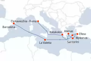 Itinerario : Barcelona, La Valetta, El Pireo Atenas, Santoríni, Efeso, Mykonos, Katakolon, Civitavecchia - Roma
