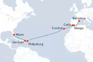 Itinerario : Miami, San Juan, Philipsburg, Funchal, Cadiz, Malaga, Barcelona