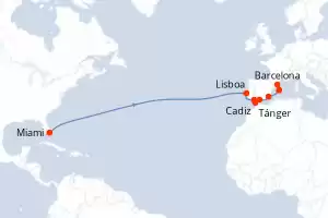 Itinerario : Miami, Lisboa, Cadiz, Tánger, Malaga, Cartagena, Palma de Mallorca, Barcelona