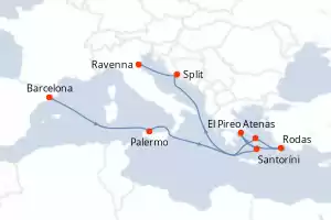 Itinerario : Barcelona, Palermo, Santoríni, El Pireo Atenas, Rodas, Mykonos, Split, Ravenna