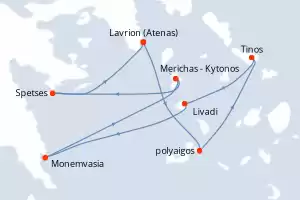Itinerario : Lavrion (Atenas), polyaigos, Tinos, Livadi, Monemvasia, Merichas - Kytonos, Spetses, Lavrion (Atenas)
