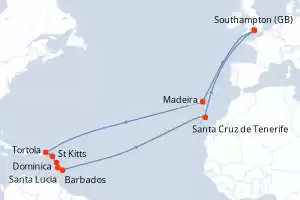 Itinerario : Southampton, Madeira, Tortola, Saint Martin (Antilles Néerlandaises), St Kitts, Dominica, Santa Lucia, Barbados, Santa Cruz de Tenerife, Southampton