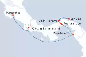 Itinerario : Colón - Panama, Fuerte San Lorenzo, San Blas, Crossing Panama canal, Islas Perlas, Pacheca Island, Playa Muerto, Isla de Coiba, Rio Esquinas, Baie de Drake, Curú, Puntarenas