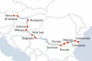 Itinerario : Viena, Bratislava, Budapest, Kalocsa, Mohacs, Novi Sad, Belgrado, Donji Milanovac, Rousse, Giurgiu, Cernavoda, Constanta, Cernavoda, Oltenita