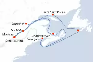 Itinerario : Montreal, Saint Laurent, Quebec, Saguenay, Charlottetown, Saint John, Saint Pierre y Miquelon, Havre Saint Pierre, Montreal